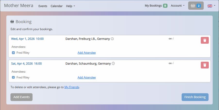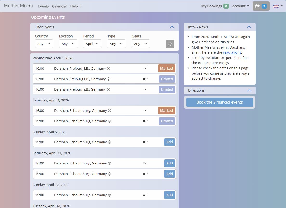 - On days where more than one event is listed and you have marked one of them the other events now have buttons labelled "Limited". This is because you are only allowed to attend one Darshan or Meditation per day.